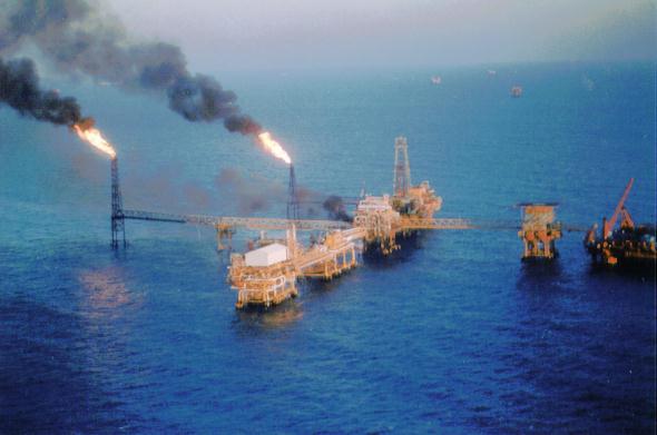 Restos de uno de los numerosos muelles. Derecha, plataforma petrolera en la Sonda de Campeche.