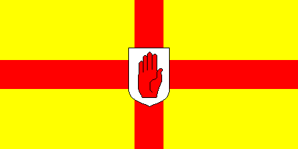 Furthermore, notice the use of the word "Ulster". Three of the nine counties of Ulster are in the Free State of Ireland, of the six occuppied by the British, Protestants hold the majority in only two. See this map for the color version of the 26 districts of occupied Ireland. The Loyalists' use of the word "Ulster" is an act of arrogance, inspite of their numerical majority, the land is mostly in the hands of Irish nationalists. To the left, is the real flag of the province of Ulster bearing the red hand of the O'Neils of Tyrone with red cross and gold field of the De Burgos, the last Earl of Ulster. Also, the word "union" is most often used in reference to Loyalists. UNION rejects this reference. Unionism should be an Irish word for a united Ireland, not for British partitionists.