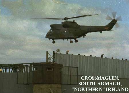 The Lawyers Alliance met members of the South Armagh Farmers where helicopter flights continue to take place since the last cease-fire. The residents stated that RUC helicopters would fly as low as the single level dwellings. The mountainous area is known as "bandit country" and the RUC and Army do not use ground vehicles here. On every hill top, there is a military building with surveillance equipment. Cameras are on poles along the road, like some of the roads in Belfast which has several surveillance towers.