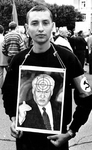 Какой теперь Макашов выиграет доверие избирателей, если Путин бомбит, а Макашов нет?! Какой Баркашов выиграет, если даже ведущий ОРТ Мишенька Леонтьев призывает к ковровым бомбардировкам, и “закатать в асфальт” Чечню? Даже спокойный АиФ публикует письмо “Братки, поможем милиции!”, Якобы от лица криминального авторитета. Баркашов, Макашов, а уж тем более, Лимонов – мы просто голуби мира в сравнении с Путиным и Леонтьевым. Национальное единение – это великолепно, но только почему под водительством правительства президента, который загубил СССР, отдал немерянные пространства под сапог своих дружков по ЦК: Кучмам, Назарбаевым, Ниязовым, Каримовым, Алиевым, Шеварднадзе и другим царькам? Я ни х.. не хочу в такое национальное единение, созданное на крови своих и чужих.