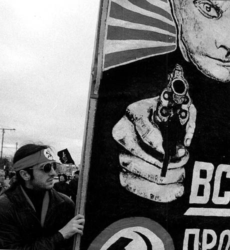 Сижу за совершение трёх эпизодов из политических соображений. Три акта с использованием коктейля Молотова. Первый против организации УНА-УНСО, вторая против Просвiти, третий – Израильский информационный центр. Идея, которой я руководствовался, проста – Славянское Единство. Относительно этого легко выявляются противники: 1) национал-сепаратизм (украинские националисты); 2) предательская, зажравшаяся номенклатура; 3) Сионский червь (Израильский информационный центр. Мои соратники так же сидят, срока : 8 лет, 4 года, мне дали 9. Познакомившись с вашей партией с помощью “Лимонки”, я увидел самое большое соответствие моим взглядам.