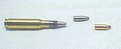 This is a .308 Win. case loaded with a sabot/Sierra 55 grain HP Match bullet. The two unloaded bullets are molyed and plain Sierra 55 grain HP Match bullets.
