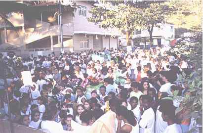 Uma multidão assiste atenta as apresentações teatrais.