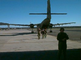 As the last plane load of cadets leave the DHC-4 Caribou, the next group prepares to board. |