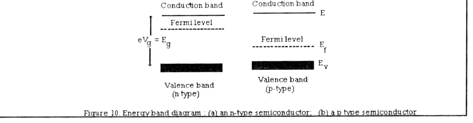 A semiconductor laser uses special properties of the transition region at the junction of a p-type semiconductor in contact with an n-type semiconductor. In semiconductor materials, because of the extensive interaction of energy between atoms, the energy levels form bands. Energy band diagrams for an n-type and a p-type semiconductor are depicted in Fig.10. The energy gap between the valence band and the conduction band is designated by Eg and is measured in electronvolts,e.g., the Fermi level Ef is the level that divides the occupied from the unoccupied levels.