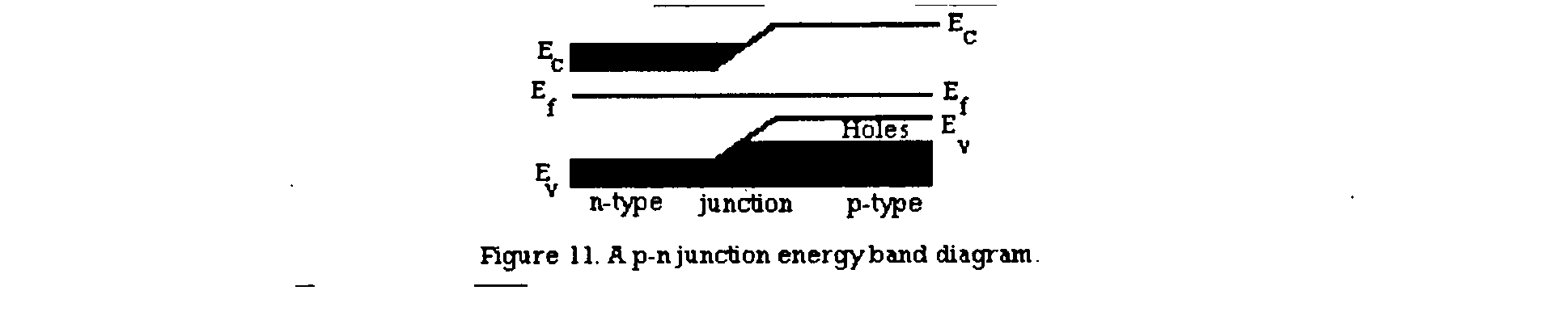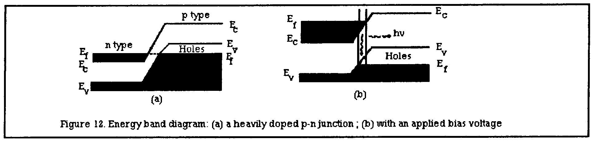 In a p-n junction, as shown in Fig.11, the energy levels readjust in accordance with thermodynamics so that the Ef band is the same through the junction. The valence band Evv and the conduction band Ec of the p-type semiconductor are higher than the corresponding bands of the n-type semiconductor. If a positive voltage is applied on the p side (the so-called positive bias), the electrons on the n side will be attracted by the applied voltage and will cross into the junction region. There they recombine with the holes that have been pushed into the junction region by the positive bias. This process will continue as long as the external circuit is on, because the electrons and holes that have recombined are continuously replenished.