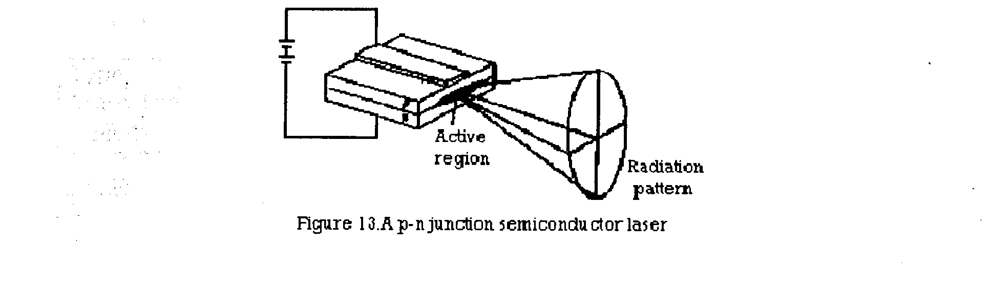 Fig.12a shows the resultant energy levels. When a positive bias is applied on the p-side, there is a transition region with a high concentration of electrons and holes, as shown in Fig.12b. This region serves as a population inverted medium, which amplifies the radiation emitted within it through electron - hole recombination. A p-n junction semiconductor laser is illustrated schematically in Fig.13. The shaded area is the transition region where the laser action takes place. This region is about 1-2 mm thick, and tens of micrometers long. As a result, the emission is squeezed into a thin plane, leading to an elliptical cross-section of the beam.