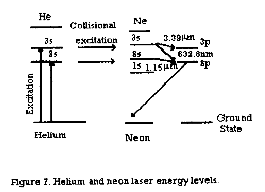 laser (most frequently use) with its familiar red beam (Fig.6). The laser medium is a mixture of helium and neon gases. An electrical discharge, in the form of direct current or radio frequency current, is used to excite the medium to a higher energy level. The pumping action takes place in a complex and indirect manner. First the helium atoms are excited by the discharge to two of the excited energy levels (Fig.7). These two levels happen to be very close to the 3s and 2s levels of the neon atoms. When the excited helium atoms collide with the neon atoms, energy is exchanged, pumping the neon atoms to the respective levels. The atoms at the neon 3s level eventually drops down to the 2p level, as a result of stimulated emission, and light of wavelength 632.8 nm is emitted. The atoms at the 2s level, on the other hand, drops to the 2p level by emitting light at 1.15 nm. However , the atoms at the 3s level may instead drop down to the 3p level, by emitting light at 3.39 mm. 632.8nm is in the visible range.