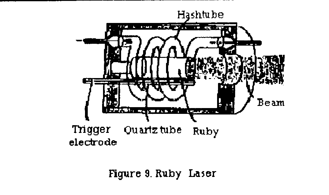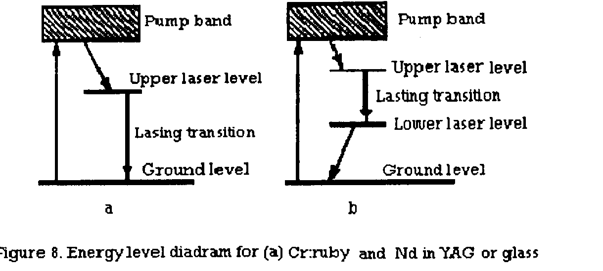 The Nd:YAG laser is a good example of the most commonly used solid state lasers. The laser medium is made up of yttrium- aluminium-garnet, with trivalent neodymium ions present as impurities. The laser transition involved corresponds to a wavelength of 1.06 mm, in the near infrared region (Fig.8,9).