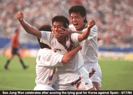 J.W. Seo celebrates after his goal against Spain in 94 World Cup
