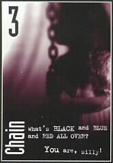 If you haven't played this game yet, I heartily recommended it. It's made by Atlas Games, and it just rocks. I can't say enough good things about it. If you have been reading the rest of my homepage, then you'd know that I'm really into games; collectible card games especially. Lunch Money is not a collectible card game, but I think it wouldn't be as good as it is if you had to go buy boosters for it. When you buy Lunch Money, you're buying the whole set of 110 cards. That's all you have to buy! Really! The setting of the game is simple; you're a bunch of kids in a schoolyard that are viciously fighting for lunch money. I mean vicious when I write it folks! These kids use knives, chains, spinning backfists, chokes, headlocks, and basically whatever tactics you used when you were in kindergarten fighting it out amongst yourselves. The basic strategy is this: You start out with 15 points of life, and when these are gone, the game is over for you, and you just got your butt stomped! Don't cry, it'll only make everyone else pick on you more. The cards in the set are broken down into groups which have their own color so that you can distinguish them easily. You have: Basic Attack (yellow), Defense (blue), Weapons (purple), and Specialty (orange). Use these cards well, kids, cause if you don't, your ass is grass.