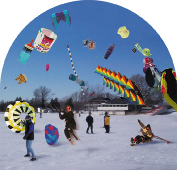 As winter sets in the ice on Puslinch can get 3 to 6 inches thick. That's when you will see kite flyers using several different modes of traction kiting. Some use down hill skiis some use boards and a couple have homemade ice buggy's The pictured buggy is designed, built and ridden by Jim Everding |