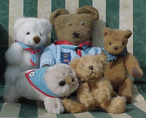 | Paull's mascots : Paula Bear, Christine (Dianne's childhood teddy, VERY old, very precious - she goes everywhere with the Guides but doesn't travel on her own) Flossie our Camp mascot, Paul the baby seal and Russell (and yes, he does - rustle, that is!) | ||||||||||||||||||||||||||||||||||