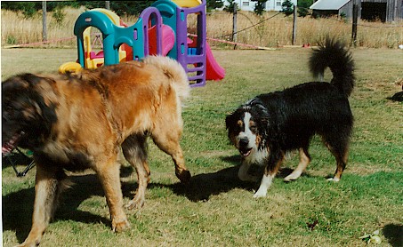 He was such a good boy... we went to a "Leonberger Party" up in Washington. About 6- 8 Leos were there, including one adolescent male who just didn't have very good doggy manners. He and another dog were starting to mix it up when Dover swept in, pushed himself right between these two (huge) dogs and got right in this guy's face. Dover told this dog, in no uncertain terms, to KNOCK IT OFF !, and then to hammer his message home he kept an eye on this dog for the rest of the day. When this dog ran around Dover would shadow him, and if he started misbehaving Dover would jump right on him -- barking, pushing, no taking any nonsense. His interventions were so quick and forceful I really can't tell you exactly how he got this K-9 "punk" to straighten up, but he did. Dog dynamics really are interesting. Despite being one of the smallest dogs there, and a visitor, there was no doubt as to who the boss was that afternoon. Dover didn't get in any fights (unlike Bri, who did not get along with another bitch), but he broke up several and kept everyone in line.