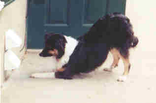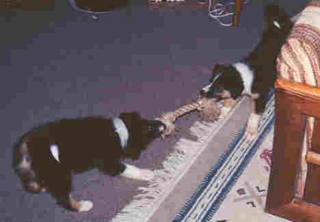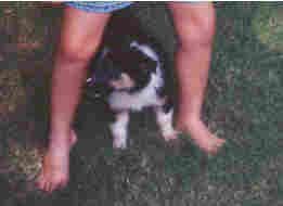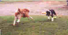 Here is a story from August, 1998, Susie and her littermate are barely eight weeks old: Yesterday I took the puppies down to the picnic area to exercise. As we arrived there, a woman arrived from the opposite direction walking her two dogs. She had an elderly Irish Setter and a cur-looking dog that may have been part Rhodesian Ridgeback. The cur raised his hackles at the pups and I thought for a minute that he was planning on having puppy for lunch, then Durango took offense and begin to tell him just whose picnic area it was. The cur tucked his tail and ran off the other direction! |