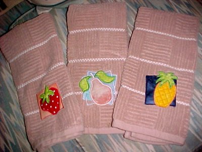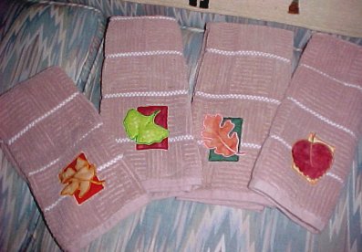 | I was in desparate need of some new kitchen towels but had to look and look for the right color. These fit the bill. I found them at Big Lots which is one of my favorite stores! For my Embroidery Club we were doing applique, so I used the towels for samples. The designs are from Cactus Punch, Signature Series 20. I used hand-dyed fabrics for some of the fruit and leaves. I like the natural look you can get by using the colorations. | |