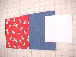 Step 4 You may stitch the squares together using factory sewing (not cutting thread between squares). I used red thread for this step to match the other fabric. |