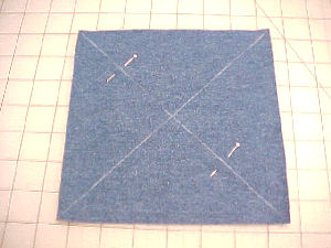Step 3 Place a blue square on top so that you have a sandwich of red, flannel and blue fabric. Mark an X in the center of the blue square and pin or use temporary spray to adhere all layers together for stitching. |
