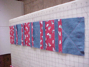 Step 7 Sew 5 squares together to form one row. I flipped my squares so that I had one red, one blue, one red, one blue, etc. You can put all of one color on one side or stagger them, as I did. Press seams open on each row as they are finished. |