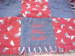 Step 12 This is a good time to add any personalization to the quilt. I used red thread in the bobbin as well as the needle since it will show on the right side and that square is red. If you don't like the idea of it showing on the other side, embroider your square before you sandwich it in Step 3. |