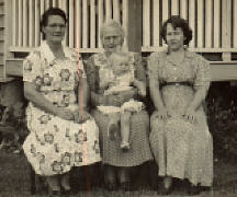 Catherine Elizabeth Angus (my grandmother), Alice Mary Bennetts (my great grandmother), Valerie Jean Muir (my mother), Marion Catherine Muir (my sister) on lap.