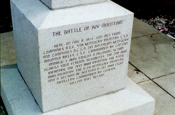 The Ivy Mountain Battlefield Monument is located on U.S. Route 23 between Prestonsburg and Pikeville. It stands on Kentucky Highway Department property a few hundred yards north of the Ivel Post Office and the mouth of Ivy Creek. It was here, on November 8th, 1861, that the Battle of Ivy Mountain was fought. Plans are in the works to landscape the land around the monument and create a small picnic area on the riverbank below it. The two fiberglass panels which flank the monument will contain pictures, maps, and texts giving further information about the battle and the people who fought it. |