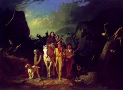 Samuel May was the second oldest son of John and Sarah Phillips May, one of the pioneer families of Eastern Kentucky. Originally from Martinsburg, Berkeley County, Virginia, where they were married in 1780, John and Sarah tried their luck in East Tennessee before coming to this area. In the Spring of 1800 they sold their farm on Roane's Creek in Carter County and made a long and difficult journey through Pound Gap to Robinson Creek in present-day Pike County, bringing with them their six children, their livestock, and wagons filled with all their worldly possessions. George Caleb Bingham's painting of Daniel Boone Escorting Settlers Through Cumberland Gap gives us some idea of what the journey through Pound Gap must have been like. |