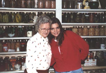 Here Mom and Mandy pose in front of shelves of canned goods. When I was looking for photos of Mom with flowers, most of the pictures I found were of her preparing or serving food. But to be honest most of the vegetables were grown or supervised by Dad. There were many hours of us picking beans and pulling them from the vines and then breaking them for canning or freezing. The job of cleaning and preparation was a joint effort but the canning or freezing and cooking was always done by Mom.The room in this picture was surrounded by windows on two sides which was full of plants. These plants were always healthy. It was one of the first signs of Mom's failing health when the plants in the windows started turning brown. I will try to find a photo which includes the plants in those windows to add here.