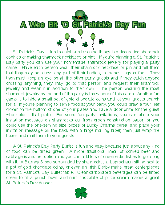 ~AN IRISH WISH~ May you always have... A sunbeam to warm you, Good luck to charm you, And a sheltering angel So nothing can harm you, Laughter to cheer you, Faithful friends near you, And whenever you pray, Heaven to hear you. May your joys Be deep and many, May your heart be light and glad, May you have the best St. Patrick's Day That you have ever had. |