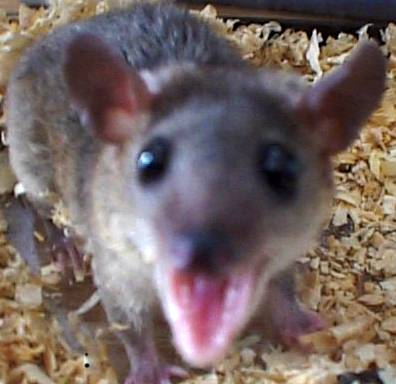 This is what Sugarcube does when she is frightened or startled. She will open her mouth really wide to show her 50 tiny teeth. This usually only lasts a few seconds. It's pretty intimidating to people who don't know her or about Short Tailed opossums.
