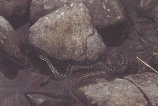 The Adder -Vipera berus- is Scotlands only poisonous snake and has claimed a few lives in it's time, although this is a very rare occurence and there has been no record of a death for a number of years. The other snakes that occur are not poisonous, they are the grass snake and the slowworm. The Adder is found all over the mainland and on some of the islands but is more common on the dry moorland in the east of the country. The Adder pictured is slivering down a stream in Glen Rosa on the Island of Arran.