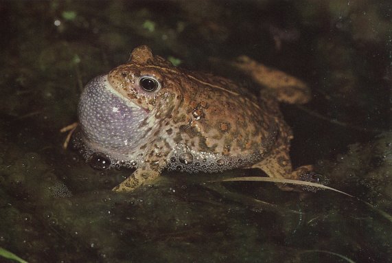 Natterjack Toad -Bufo calamita- which puffs up to a huge size while croaking occurs in coastal areas and heathland. Its occurence is affected by cattle that step in the pools that it's tadpoles are forming in , they also pollute the pools with there dung reducing the chance of the tadpoles forming properly, if uncommonly warm the sun can also be an obvious problem at these times, drying out the pools leaving the tadpoles to die in the muddy hole where the water once was. Fertiliser and other chemicals used by farmers is also a significant problem for Natterjack toad's.