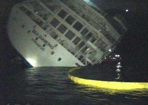 ![]() On 5th April 2007, the passenger cruise ship SEA DIAMOND struck a reef off the Greek island of Santorini. All passengers and crew were evacuated, but it was (wrongly) thought the vessel would be salvageable. Salvors towed the SEA DIAMOND off the reef, thinking that the vessel had been stabilised. Sadly, they were wrong and 15 hours after having initially struck the reef, she went down to lie beside the reef on the sea bottom. Issues over leaking fuel oil from the wreck persist between the owners and the Greek authorities.