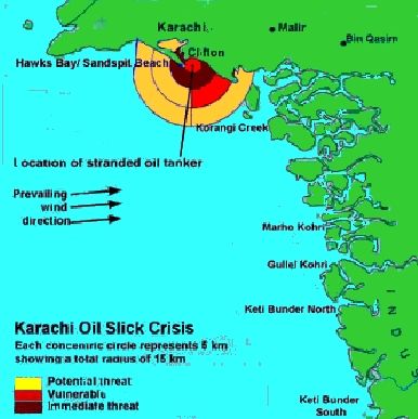 On 27th July 2003, a Pakistan National Shipping Corporation (PNSC) chartered (Maltese flagged) oil tanker, TASMAN SPIRIT carrying 67,500 tons light crude oil for a Pakistani refinery, grounded at 1.5 nautical mile from shore while cruising in the curved entry channel of Karachi Port Trust (KPT) during heavy weather. The ship was 24 years old and failed to overcome the tidal forces, causing it to deviate from its intended course, and run aground. Unsuccessful attempts were made to pull the grounded ship free, but during the process, oil started to leak out, then poured - in a highly sensitive ecological area, polluting about 10 km of coastline.