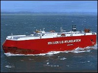 The great feature of modern car carriers is also their greatest weakness - the single car deck. Having no bulkheads on this deck, allows for large numbers of vehicles to be be transported, BUT... should this deck ever be exposed to the sea, then there is nothing to stop the sea water entering and very quickly, destabilising the whole vessel - exactly what appeared to happen when the KARIBA hit the TRICOLOR and breached the car deck. The Tricolor went over very quickly, while the KARIBA limped into port, her bow severely damaged. Click on the image on the right to visit the havenarbeiders website that shows incredible photos of the salvage operation.