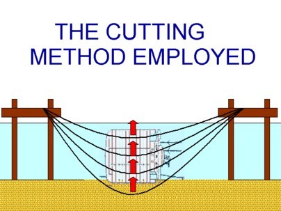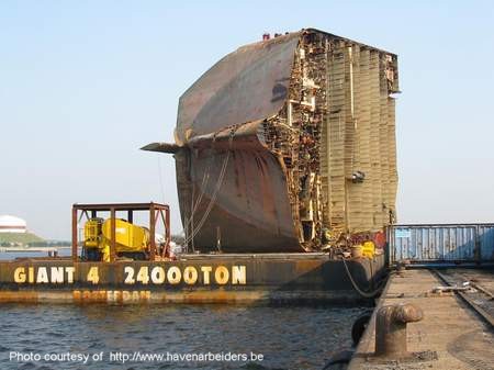 The wreck lay on its side in the English Channel until August 2003, when the operation to cut it up was finally put into action. The method was to (literally) cut the whole ship up into pieces, as if it were a huge cake. To achieve this, two large platforms were placed either side of the wreck and a chain placed beneath the wreck. This chain was then used as a saw, which scythed the TRICOLOR up into manageable chunks that could then be lifted away (cargo and all !) by means of a heavy lift crane.