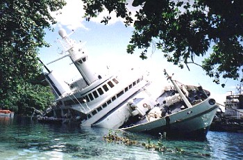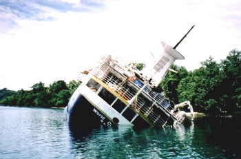 ![]() | Passengers beware.." The "WORLD DISCOVERER" found rather more in April 2000 than her name suggests.... 1) Don't take a large, VERY expensive cruise vessel up a river you don't know 2) Take up to date charts with you. 3) Remember, ships need water to float on.... |