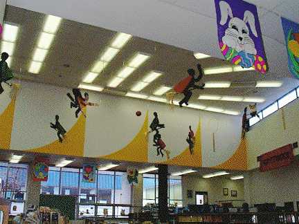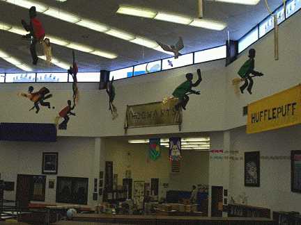football-sized, red Quaffle to each other trying to get it through one of the six