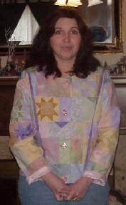 This is me wearing the Jacket I made for myself for Spring 2000. I used all my favorite fabrics.....Fossil Ferns, Moda Marbles, and Batiks to create this soft look. Take a look at the Scrap Star quilt on my Quilt Gallery page. I made it with many of my leftover squares from this jacket.
