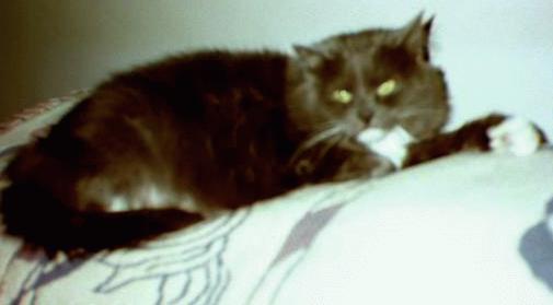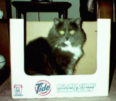 Hi, my name is Ashley. I am a grey and white, hymalayan-mix, medium-length haired cat. My parents adopted me from the animal shelter in May of 1992. People say I am like a dog because I am so friendly. Being a cat, I resent this remark. Here are a couple of pictures of me!!