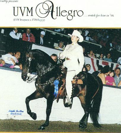 Allegro was just a three year old when we booked to him for the first time and he had captured seven championships in that year, his first show season. With bloodlines and athletic ability like this guy, we are anxiously awaiting our July 1999 foal by him.