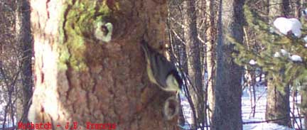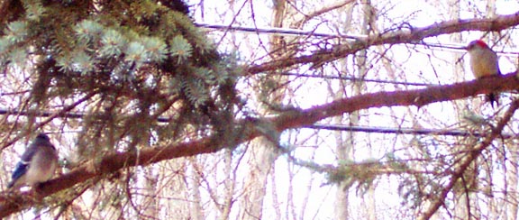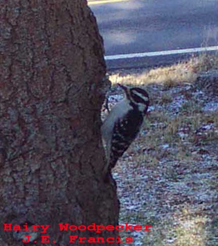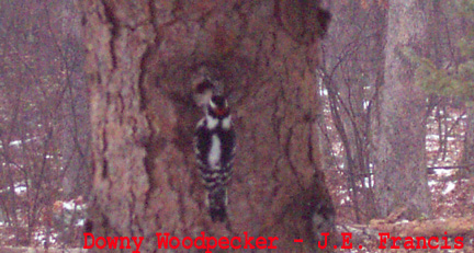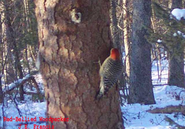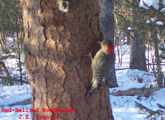 Dec. 13, 2000. Blue Jay (Cyanocitta cristata) and Red Bellied Woodpecker (Melanerpes carolinus). Lords Valley, PA., by J.E. Francis. See bottom right for description of Red-bellied Woodpecker
