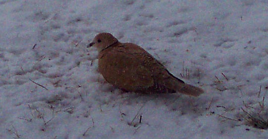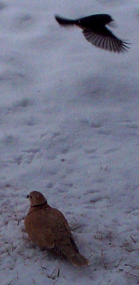 Dec. 30, 2000. Ringed Turtle Dove (Streptophelia risoria 12") First time I've ever seen this bird. Must have blown in with the storm. Slate-colored junco in flight, top right.