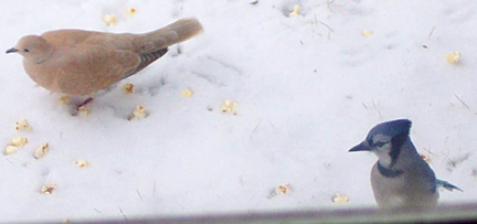 1/6/2000 Ringed Turtle Dove with Blue Jay, feeding on popcorn.