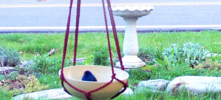 Our first Indigo Bunting(Passerina Cyanea 5 1/2")) and his mate arrived here today, May 14, 2002. The male landed in our feeding tree and took my breath away. He flew down into the grass which was high with dandelions gone to seed, after the heavy Spring rains. Both he and the female, stepped on the stems of the dandelions and fed on the fluffy seeds. What a treat. A very beautiful pair.