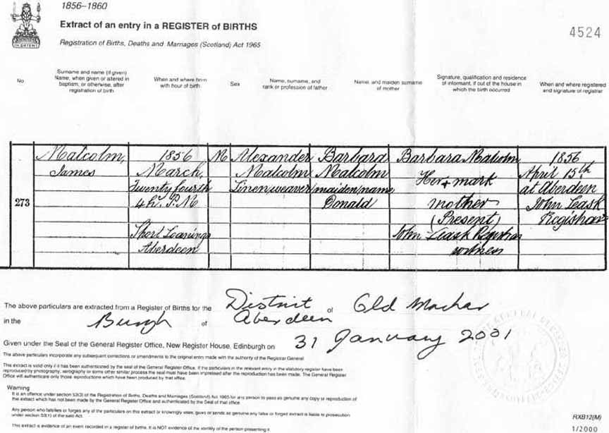 Birth Register for James Malcolm, March 24, 1856, via "Scotch Origins".