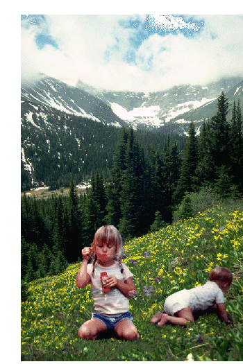 Now look at the touched-up photo. After cropping the girls out of the original I placed them on a serene mountain side. I only wish we really could have been there!