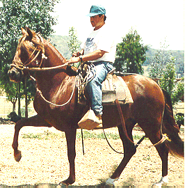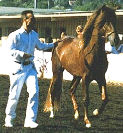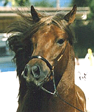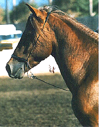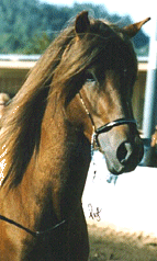 R.A. Bartolomeo, shown for his first time in halter (by myself - what a kick to show your very first baby!!) at the S.C.P.P.H.C. Grand Championship Show last October in Pomona, CA. He took 2nd in his class and qualified for Championships! He is a gorgeous dark chestnut with a long, flowing mane and forelock (he looks the spitting image of his sire) and is going to be absolutely as smoothe as glass (like butter!!!)