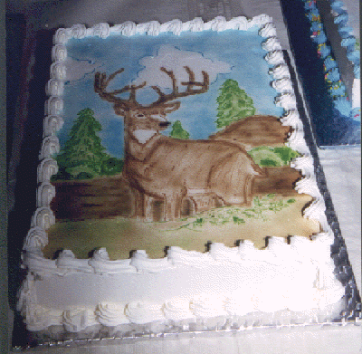 This cake is basic air brush, it is a 9 X 13 cake iced with borders. I made the stencil for the cake using a picture of a deer. The stencil was cut out using a stencil cutter then sprayed onto the cake. The deminsion was added by getting closer to the cake with the airbrush.