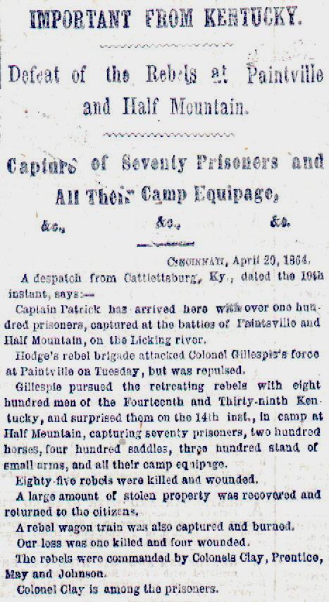 This is the newspaper account from the New York Herald reporting the events of April 14th, 1864, at Half Mountain, Magoffin County, Kentucky. This may be the 39th Kentucky Mounted Infantry's only national press and thus their greatest claim to fame (collection of Robert M. Baker).